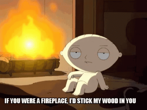 Stewie Griffin delivers a suggestive pickup line while sitting in front of a roaring fireplace.