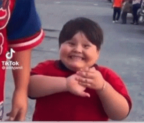 Iker Millonario, a young boy in a red shirt, smiles and claps his hands excitedly.