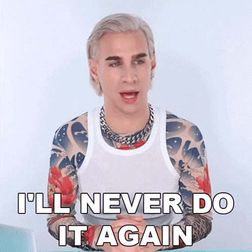 Brad Mondo, with tattoos and a white tank top, declares "I'll never do it again" with a serious expression.