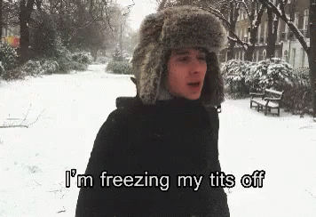 Danis Not On Fire in a snowy park, bundled up in a fur hat, exclaiming about the cold.