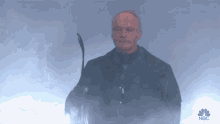 Creed Bratton as Michael Scarn makes a dramatic, foggy entrance, holding a hockey stick.