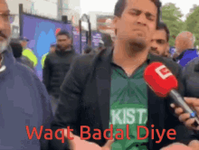 Man in Pakistan shirt passionately expresses 'Waqt Badal Diye' during an interview, gesturing emphatically.