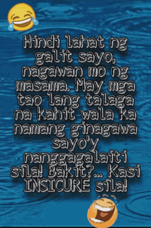 A Filipino quote about insecurity, featuring laughing emojis on a blue background.