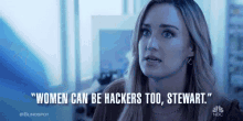 Ashley Johnson's character in Blindspot states 'Women can be hackers too, Stewart,' followed by a man's reply.