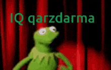 Kermit the Frog with his mouth open in front of a red curtain, displaying the text 'IQ qarz darma'.