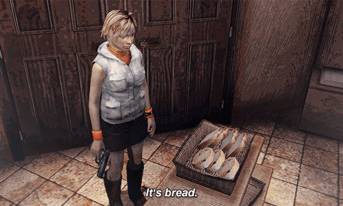 Cheryl Mason from Silent Hill observes bread while holding a gun, stating 'It's bread.'