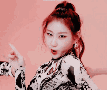 Itzy's Chaeryeong performs a dance, wearing a striking black and white patterned top with her hair in a high bun.