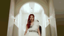 Itzy member showcases powerful dance moves in a striking white feathered outfit and a sleek black leather ensemble.