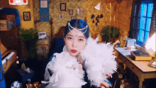 IU, with blue hair and a feather boa, dances and poses in a vibrant, decorated room.