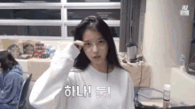 IU, also known as dlwlrma, shows off her cute side and flips her hair in various outfits, including glasses and a white shirt.