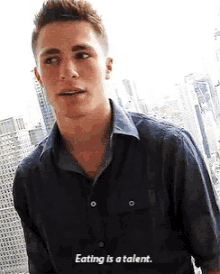 Jackson from Teenwolf discusses eating as a talent, wearing a blue shirt in a bright setting.
