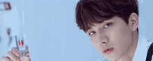 Jaehyuk holding a test tube with red liquid, looking intently at the camera against a light blue background.