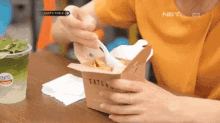 A woman enjoys contemporary Indonesian street food from a takeaway box, featured on NET. HD's 'Chef's Table'.