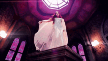 Red-haired woman in a sparkling white gown and crown stands regally in a dramatic, purple-lit gothic setting.