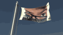 A flag with a man's face and the word 'Medo' (fear) waves against a blue sky.