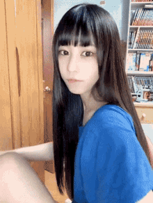 A Japanese girl with long black hair and bangs, wearing a blue top, makes various expressions while looking at the camera.
