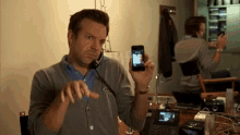 Jason Sudeikis multitasking, talking on a landline phone while simultaneously holding a smartphone.