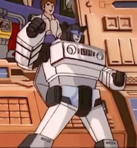 Transformers G1 Autobot Jazz carries a boy on his shoulders in a control room.