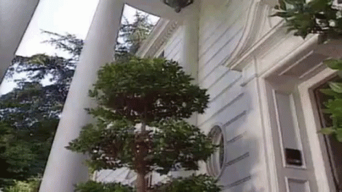 Jazzy Jeff's house exterior, featuring a grand white facade and a manicured tree.