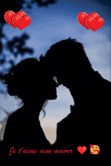Romantic silhouette of a couple kissing under a night sky, with 'Je t'aime mon amour' text and hearts.