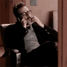 Jeffrey Dean Morgan sits in a chair, talking on a cell phone and touching his beard.