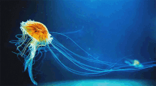A vibrant jellyfish with long, flowing tentacles gracefully swims in the deep blue underwater.