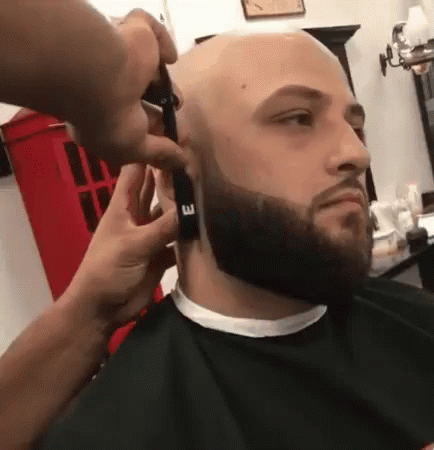 A barber meticulously trims a man's full beard with a straight razor, creating a sharp, cool look.