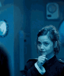 Jenna Coleman as Clara Oswald, smiling and gesturing in her dark uniform from Doctor Who.