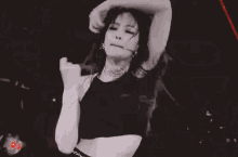 Jennie Kim of Blackpink performing an energetic dance on stage in a black crop top.