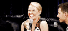 Jennifer Morrison laughs joyfully while holding a microphone during an event.