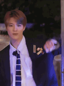 Jeno NCT looking sharp in a suit and striped tie, standing against a backdrop of purple light.