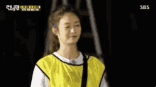 Jeonsomin, also known as Jeon Sobari, smiles brightly in a yellow vest during an episode of Running Man.