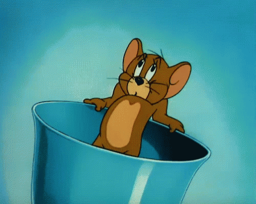 Jerry the mouse looks scared and panicky, clutching his chest while sitting inside a blue cup.