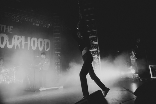 Jesse Rutherford of The Neighbourhood swings from a microphone chain during a live performance.