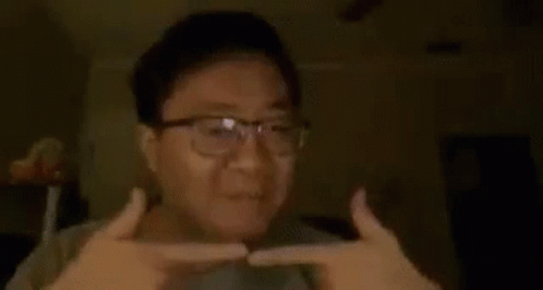 Jesse Simping makes a funny face, pointing to his chin with both hands, in a meme-like reaction.