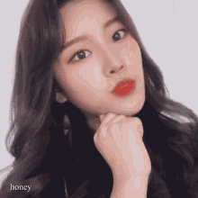 Kpop idol Jia Hwang from the group Yours poses with her hand on her chin, smiling sweetly.