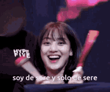 Jihyo from TWICE smiles brightly, holding a pink confetti cannon, with the Spanish caption 'soy de sere y solo de sere'.