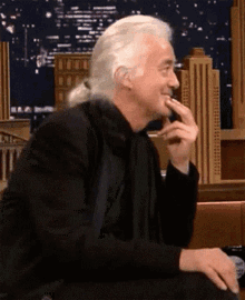 Legendary guitarist Jimmy Page, known for Led Zeppelin, is seen laughing heartily while sitting on a couch.