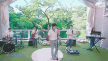 Jinyoung from GOT7 performs live outdoors with his band, singing passionately into the microphone.