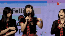 JKT48 members Eli, Lulu, and Zee on stage for a quiz show, with Eli speaking into a microphone.