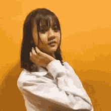 Angelina Christy of JKT48 Team KIII poses in a white shirt against a yellow wall, looking at the camera.