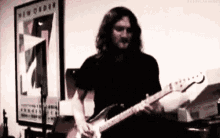 John Frusciante, the Red Hot Chili Peppers guitarist, playing an electric guitar in a room with a New Order poster.