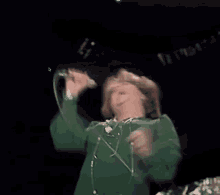 Joy Fleming, a German singer, performs live on stage in a green dress, singing energetically.