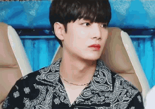 Jr Nuest, a young man, wearing a black paisley shirt and a colorful beaded necklace, looking to the side.
