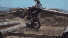 A motorcyclist performs trials stunts, balancing and jumping over logs on a Gas Gas Txt Racing250.