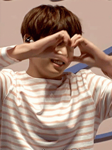 Jungkook Jk smiles while making a heart shape with his hands, wearing a striped shirt.