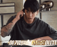 Jungkook talking on the phone in the sweet room, showing his arm tattoos.