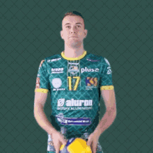 Piotr Orczyk, a player for Jurajscy Rycerze Aluron CMC Warta Zawiercie, holding a volleyball.
