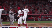 Justin Upton and Ohtani celebrate a score for the Angels during a baseball game, with the scoreboard showing 5 runs.