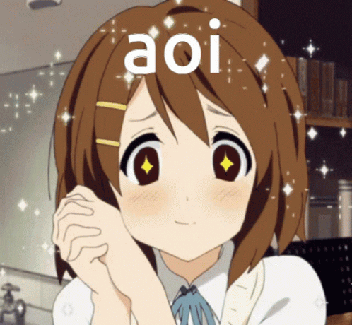 Yui Hirasawa from K-On! looking shy with 'aoi' text on her head and sparkling effects.